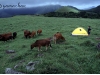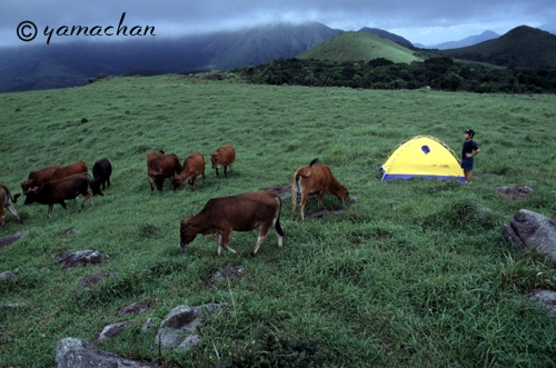 馬鞍山を過ぎた昴平で。野良牛がテントに表敬訪問?マクリホース・トレイル。