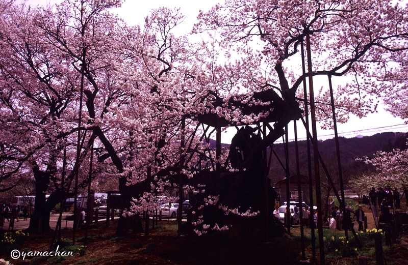 樹齢約2000年の古木「山高神代桜」。日本三大桜のひとつです。
