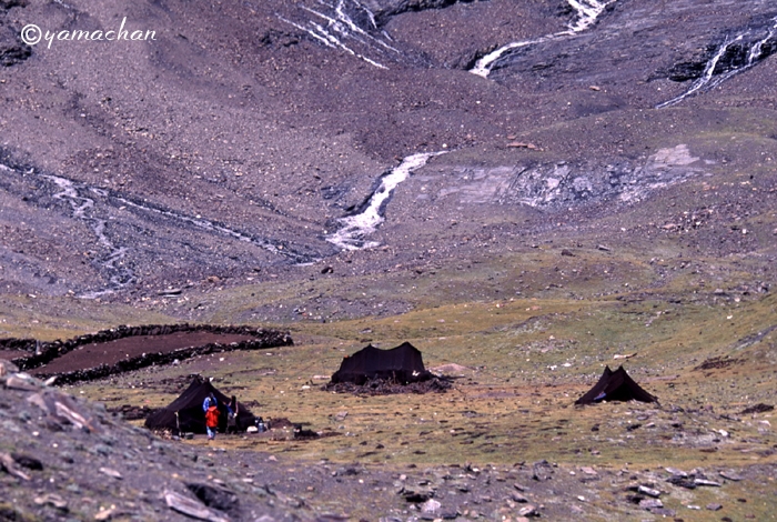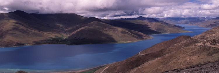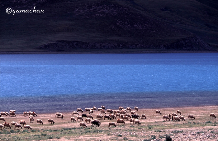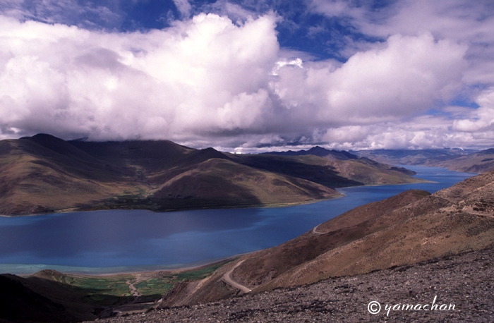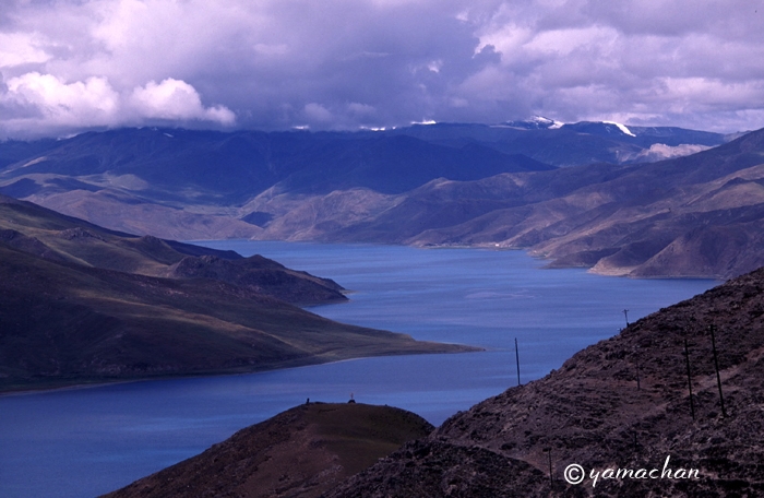 ラサ郊外にあるヤムドク湖(羊卓雍湖、Yamdruk Lake、標高4,440m)。チベット語で「トルコ石の湖」と呼ばれ、神が宿ると信じられているチベット4大聖湖の1つ。カロラ(カロ峠、標高5020m)はこの旅の最高地点。
