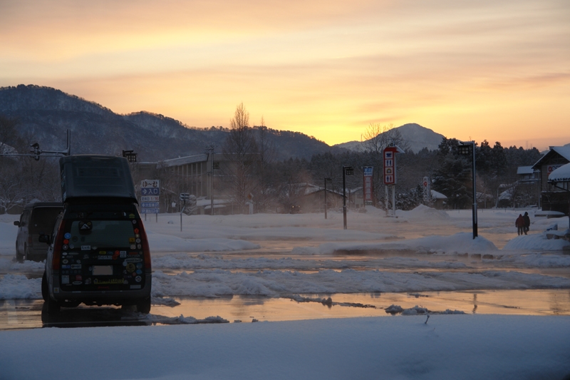 道の駅「関川」にて。朝焼けです。セオリー通り午後から暴風雪となりました。ここの農産物直売所「あいさい」もお気に入りです。