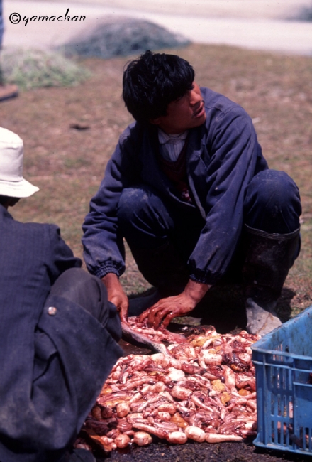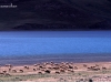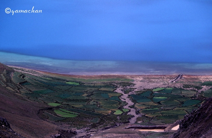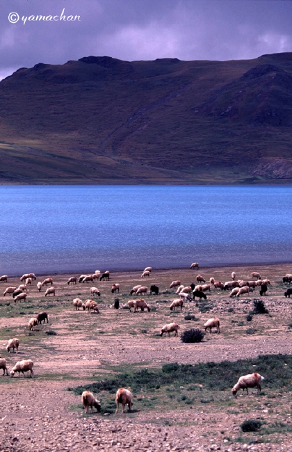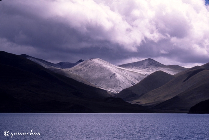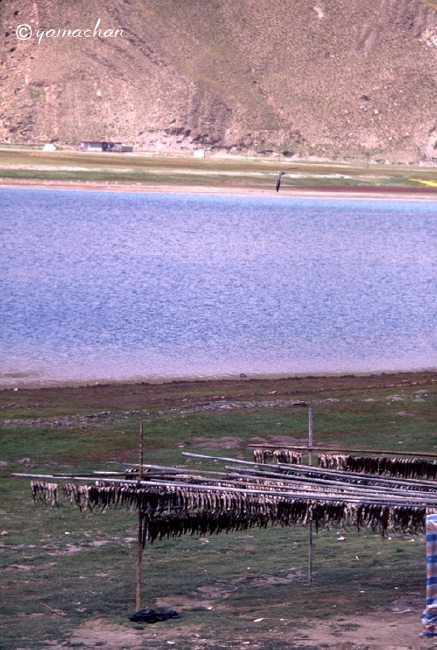 ラサ郊外にあるヤムドク湖(羊卓雍湖、Yamdruk Lake、標高4,440m)。チベット語で「トルコ石の湖」と呼ばれ、神が宿ると信じられているチベット4大聖湖の1つ。カロラ(カロ峠、標高5020m)はこの旅の最高地点。